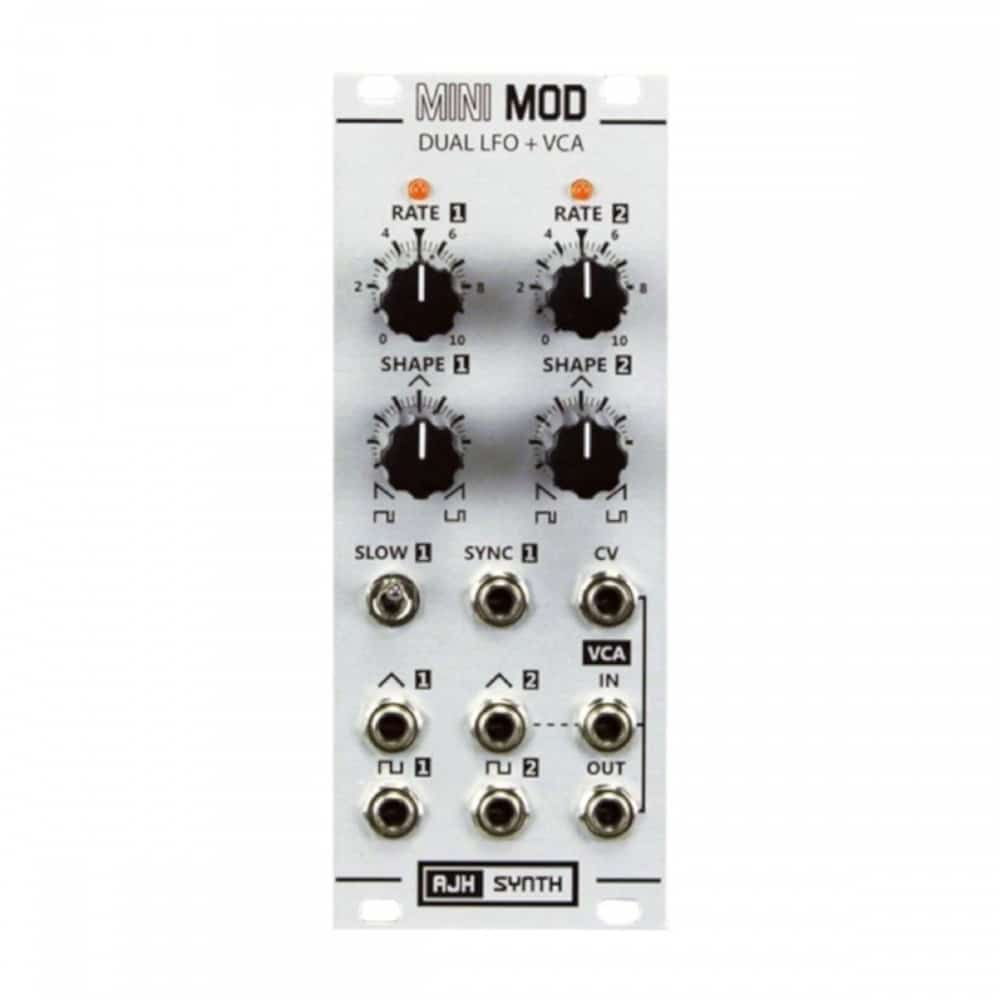 The MiniMod Dual LFO and VCA is a compact 10hp wide Eurorack format module. It comprises two independant LFO’s with variable wave shapes and a DC coupled VCA. In addition LFO1 includes an extra low range and a Sync (reset) input.