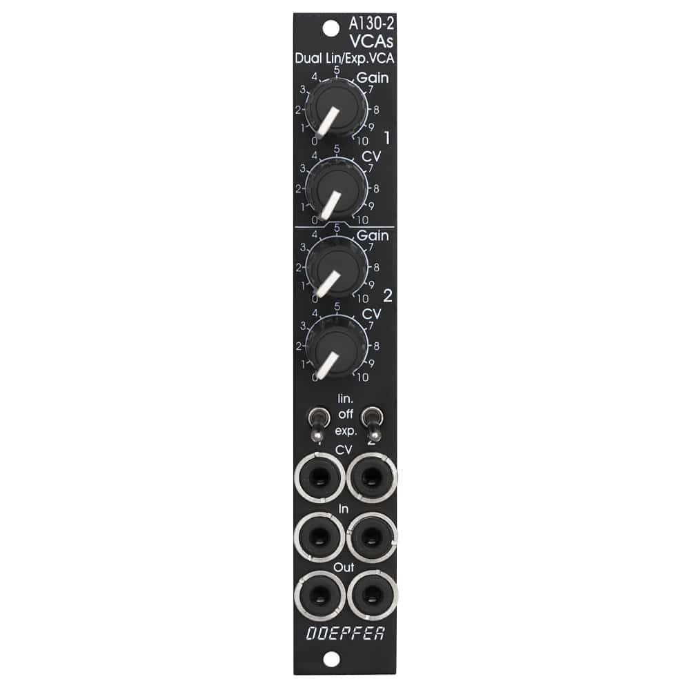 Module A-130-2 is the slim version of module A-132-3 and offers essentially the same features. But the distances between the controls are smaller and rubberized small-sized knobs are used. In return the front panel has 4 HP only which is half the width of the A-132-3. The module is primarily planned for applications where only limited space is available.