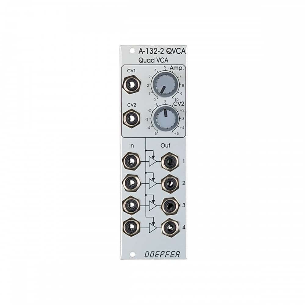 Module A-132-2 contains four linear VCAs with a common level control section for all four VCAs. The module can be used for all applications of simultaneous amplitude/level control of four different audio or CV signals. The module has a manual level control Amp. and two control voltage inputs CV1 and CV2 available. CV2 is equipped with a polarizer to adjust the effect and polarity of the external control voltage.