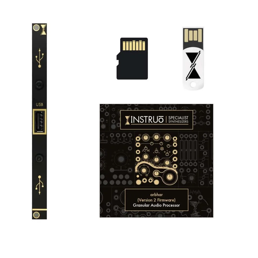 Included is a new USB drive (8GB) which contains the Instru? arbhar library containing 216 samples produced by the team. There is also a replacement microSD card included which is pre-flashed with the V2.0 base firmware. This upgrades an arbhar module immediately.