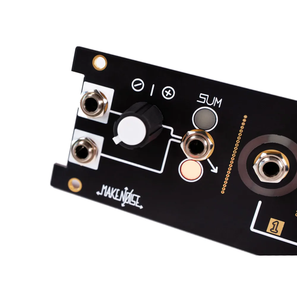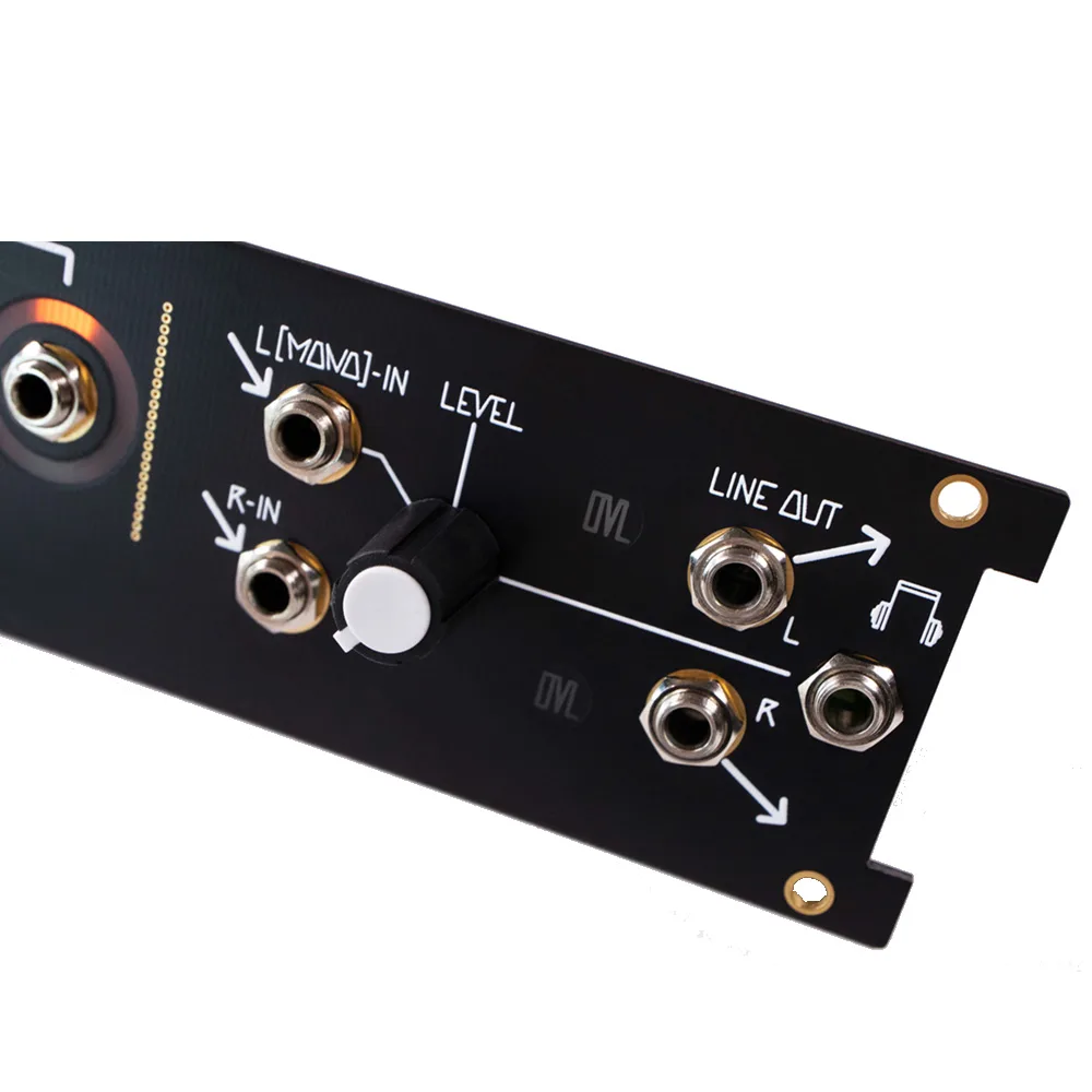 A high quality Stereo Line Driver converts powerful modular synthesizer signal levels to the commonly used Line Level. There are mini-jack inputs for Left or Mono, and Right for Stereo sound, a single master volume control, as well as a stereo line output pair, and finally a TRS line/headphone out on a single jack. This output is capable of driving a long cable out to a PA System or a set of Headphones. It is AC coupled with a built-in limiting circuit (with visual indication) that prevents damage to ears and PA system when the patching gets experimental.