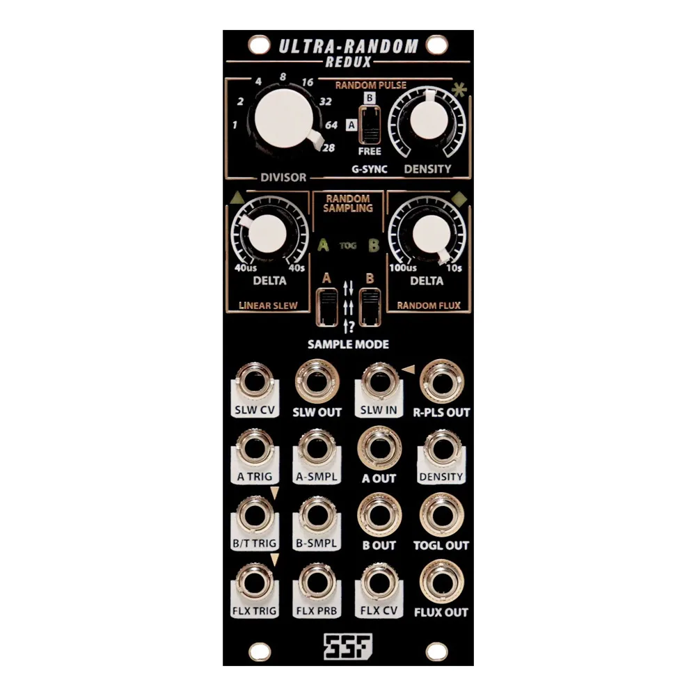 The Ultra-Random Redux is a new and revised version of the original Ultra-Random Analog. Additional features and improvements have been applied to the major functions; including more accurate sampling of external signals and greatly enhanced sample holding time. Three different output modes are now available in the sample and hold section as well, providing the traditional bipolar output as well as full and have wave rectified outputs. Rectification may also be applied to external sampled signals. The Random Pulse section now features a rotary switch to select pulse division and a newly added G-SYNC (gated sync) function for randomized pulse bursts that will be synced to the A or B trigger input signals. The Integrator has been replaced with a wide range linear slew for processing external and internal signals. The Random Pulse output is normalized to the Linear Slew input jack as in the original URA. Finally, the Random Flux section has been updated with a dedicated Flux Trigger input and manual time constant control in addition to CV modulation inputs. Flux out can also now function as a fourth stepped random voltage output.